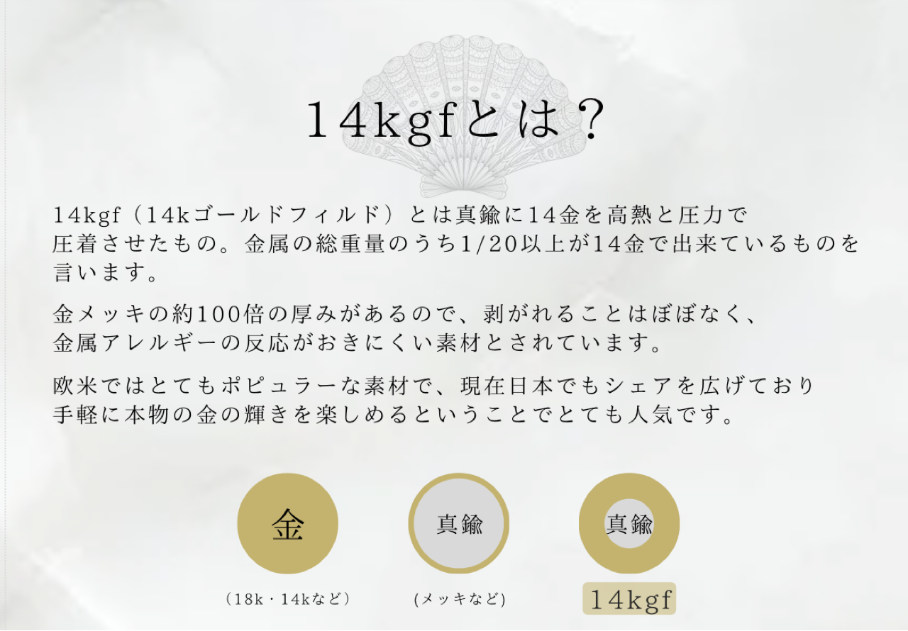 14Kgfは、その金属の全重量のうちの1/20以上が14Kでできていて、コーティングとは違い、
